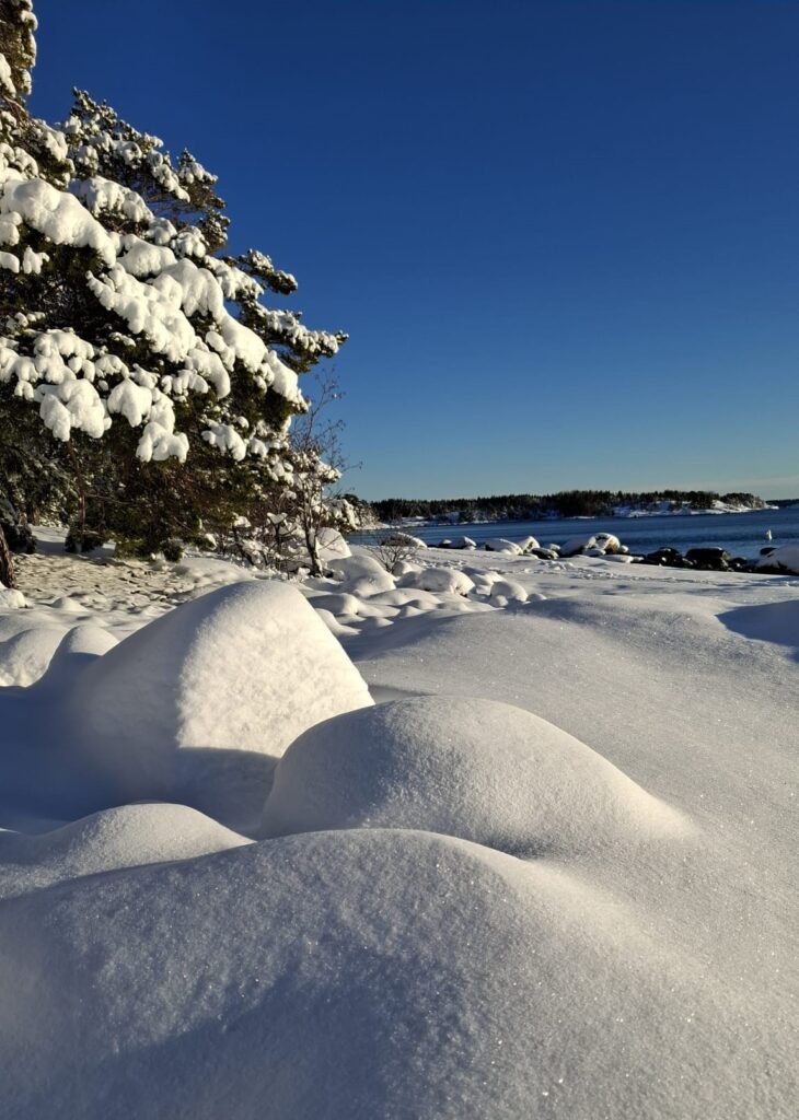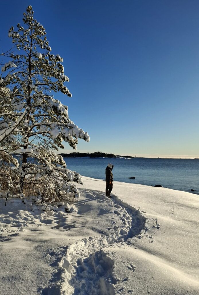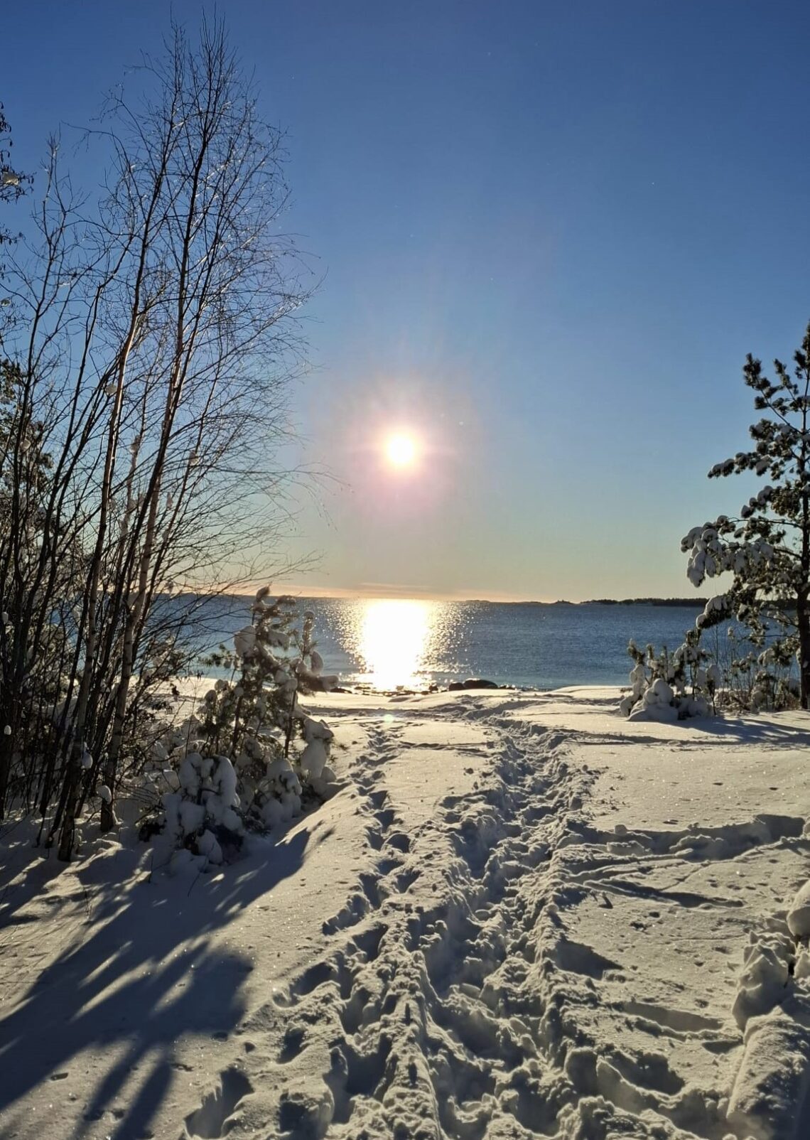 Oli ihana nähdä nämä maisemat pitkästä aikaa. Aurinko paistoi, maassa oli puhdasta valkoista lunta ja meri liplatteli avoimena. Mietin tässä ulkoiluhetkessä, että mitä se ihminen muuta tarvitsee. Kun on hetki aikaa tällaisen luontomme äärellä, niin se riittää.